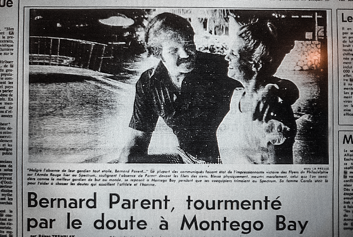 En janvier 1976, après le match du 31 décembre 75 de 3-3 au Forum, l’Armée Rouge affrontait les Flyers au Spectrum. Mais Bernard Parent, blessé, se remettait de sa blessure quelque part sur la planète.